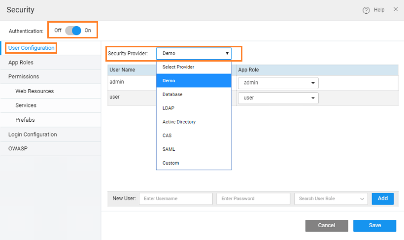When the WaveMaker developer enables security, the demo is the default option. This option, as the name suggests, is for demo purpose, ease the user into security features. Demo option provides by default two out of box users called “admin” and “user” with password same as username. Developers can add/remove users.