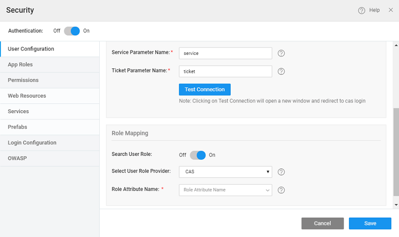 • The user can configure CAS role attribute and the same role can be configured in the WaveMaker application.  The Role Attribute Name needs to be configured.