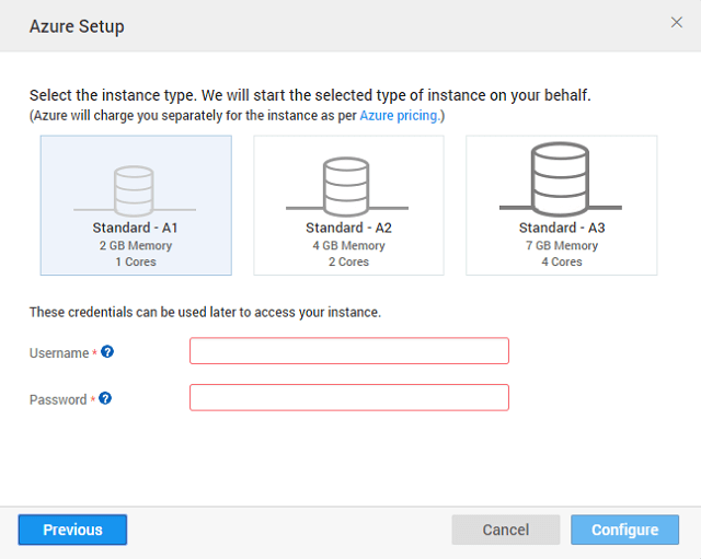 Select the appropriate instance based on your app requirements. You can choose from the three options provided (see here for size comparisons) and enter the Username and Password details. See here for more information regarding setting up of Azure VM like username, password, etc..