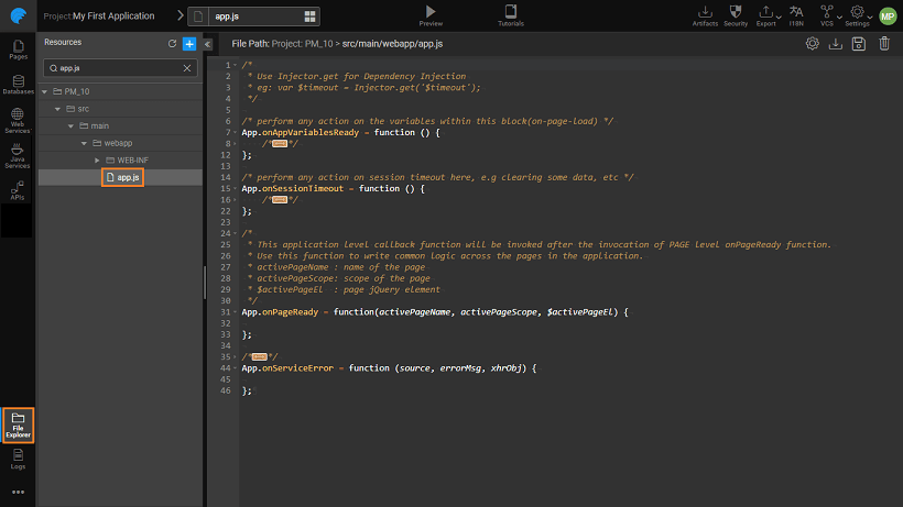 As with the Pages, App lifecycle events and variables can be accessed from the app.js file. This file can be accessed from the File Explorer.