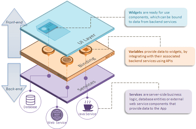 WaveMaker App can either be a web responsive application or a hybrid mobile application built using the low-code or rapid app development approach. WaveMaker App is built as a single HTML Web App, with clear separation of User Interface (UI) layer and the backend services layer using REST APIs. The UI layer is built using the visual RAD approach, with drag-n-drop of widgets onto the Canvas. Later, these widgets are integrated with the backend services, to fetch and update data. WaveMaker App is composed of 3 layers: