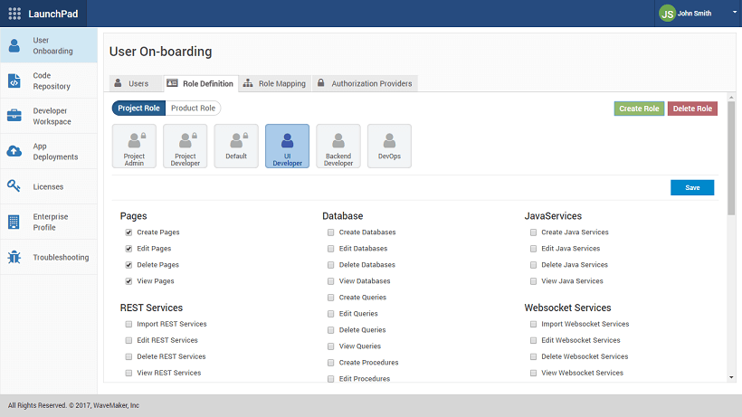 Launchpad Role Definitions: Roles can be created from the Role Definition tab of the User On-boarding section of Launchpad. As mentioned earlier the Product Roles are pre-defined with permissions set and they cannot be modified. Project Roles come with a pre-defined roles of Project Admin, Project Developer and Default.