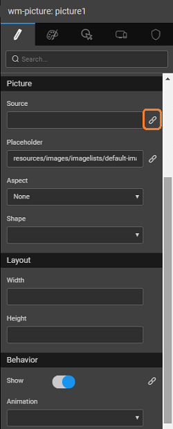 1. From the Property panel of the media widget, find the Source property. Click the Bind icon represented by a chain-link as shown in the picture below; a Bind modal dialog pops up.