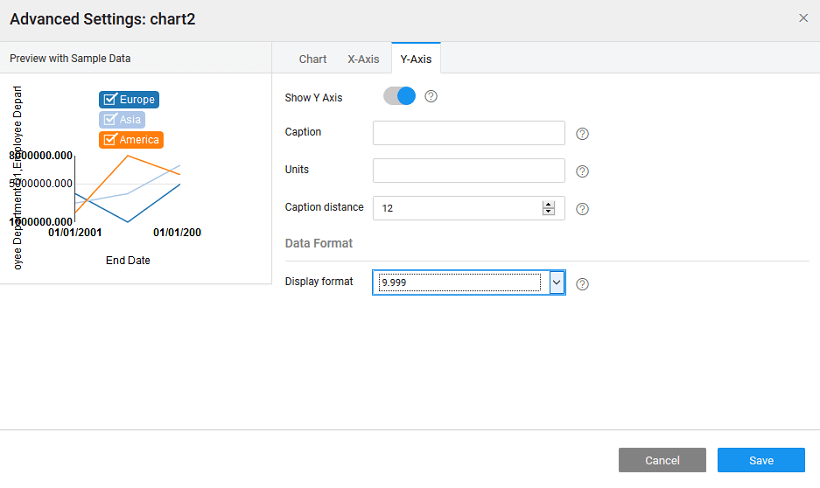 - Layout of the values can be defined in terms of location, value format, caption for line charts and more