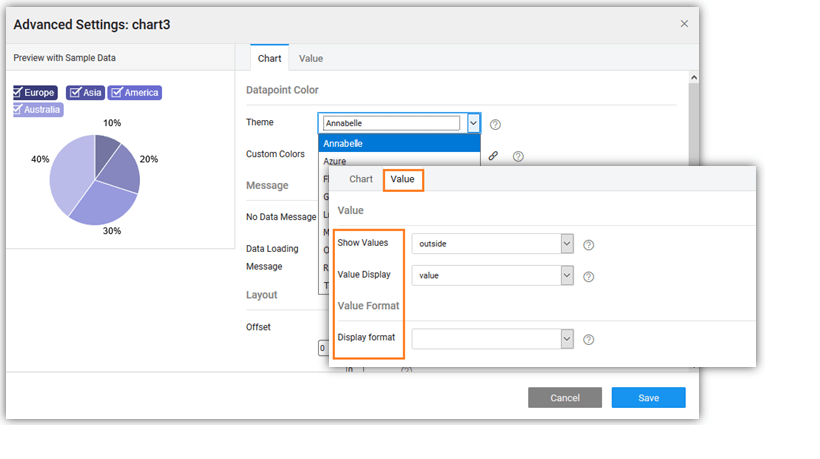 For Pie and Donut charts, the options include Label and Value fields. You can specify