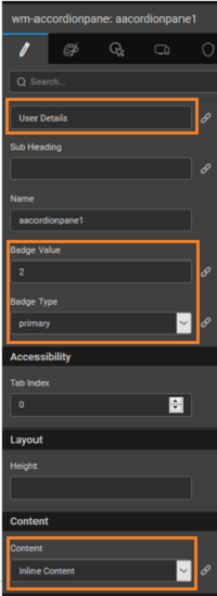 NameThe name is a unique identifier for the accordion pane. Special characters and spaces are not allowed in widget name.
