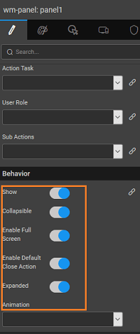 | Action Label (available only when the above Menu Actions is bound to a variable) | Label for anchor or menu tags generated dynamically. | | Action Icon (available only when the above Menu Actions is bound to a variable) | Class for the action. Example- 'fa fa-ban' or 'glyphicon glyphicon-cloud'. | | Action Link (available only when the above Menu Actions is bound to a variable) | Link for the action item. | | Action Task (available only when the above Menu Actions is bound to a variable) | Task for menu items generated dynamically. This is the action that will be triggered when the user clicks on the Menu Item. It can be a script like: Widgets.label1.show or Variables.v1.invoke() Execution order on click of Node: 1. If provided onSelect will be executed first. 2. If provided Action will be executed next. 3. If provided Action link will be executed last. | | User Role (available only when the above Menu Actions is bound to a variable) | Role for menu items generated dynamically. You can assign the property to 'userrole' which contains comma separated user roles. Each item will be evaluated with given 'userrole' for that item to that of the logged in user roles, from security. If any of the user roles bound to 'userrole' property matches then that menu item will be shown else will be hidden. | | Sub Actions (available only when the above Menu Actions is bound to a variable) | When an action is required the sub-items can be mentioned in the children. | | Behavior | | Show | Showing determines whether or not a component is visible. It is a bindable property. | | Load on Demand (visible only when show property is bound to a variable) | When this property is set and show property is bound, the initialization of the widget will be deferred till the widget becomes visible. This behavior improves the load time. Use this feature with caution, as it has a downside (as we will not be able to interact with the widget through script until the widget is initialized). When show property is not bound the widget will be initialized immediately. | | Collapsible | Enable control for collapsing and expanding the panel. | | Enable full screen | Enable control for making the panel full screen. | | Closable | This property defines if the panel should be allowed to be closed. | | Expanded | Set the default state of the panel whether it is expanded or collapsed. | | Auto Close | This property defines the behavior of menu closing, it can be: - outsideClick - close the menu when clicked outside of the menu, - always - when a menu item is selected or on click outside menu, or - disabled - do not close once opened. | | Animation | This property controls the animation of an element. The animation is based on the CSS classes and works only in the run mode. | | Graphics | | Icon Class | This property defines the class of the icon that is applied to the button. |