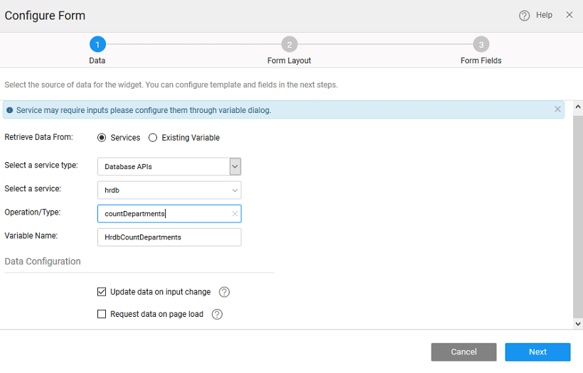 - Retrieve Data From: Services, Existing Variables or Widgets are the options provided to you for choosing the source of data.