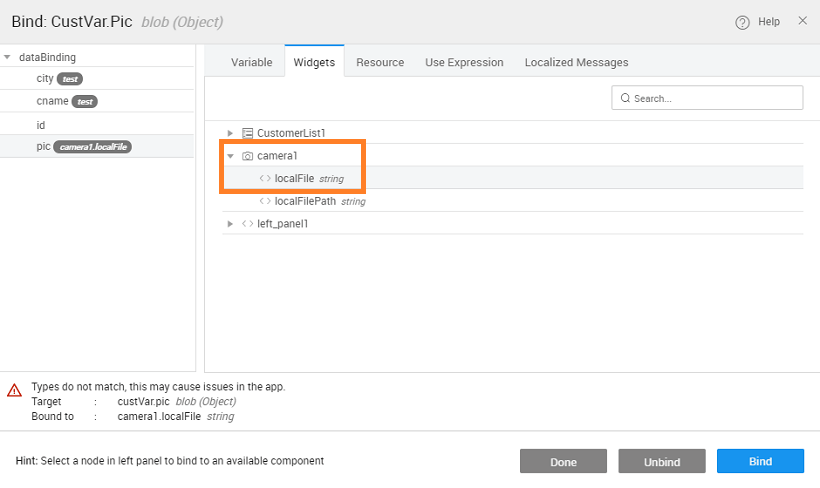 6. Bind the source of the picture to the ‘localFilePath’ of camera widget.
