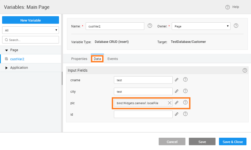 1. Bind the Input Fields from the Data tab for the CRUD Variable to the Camera -> localFile field