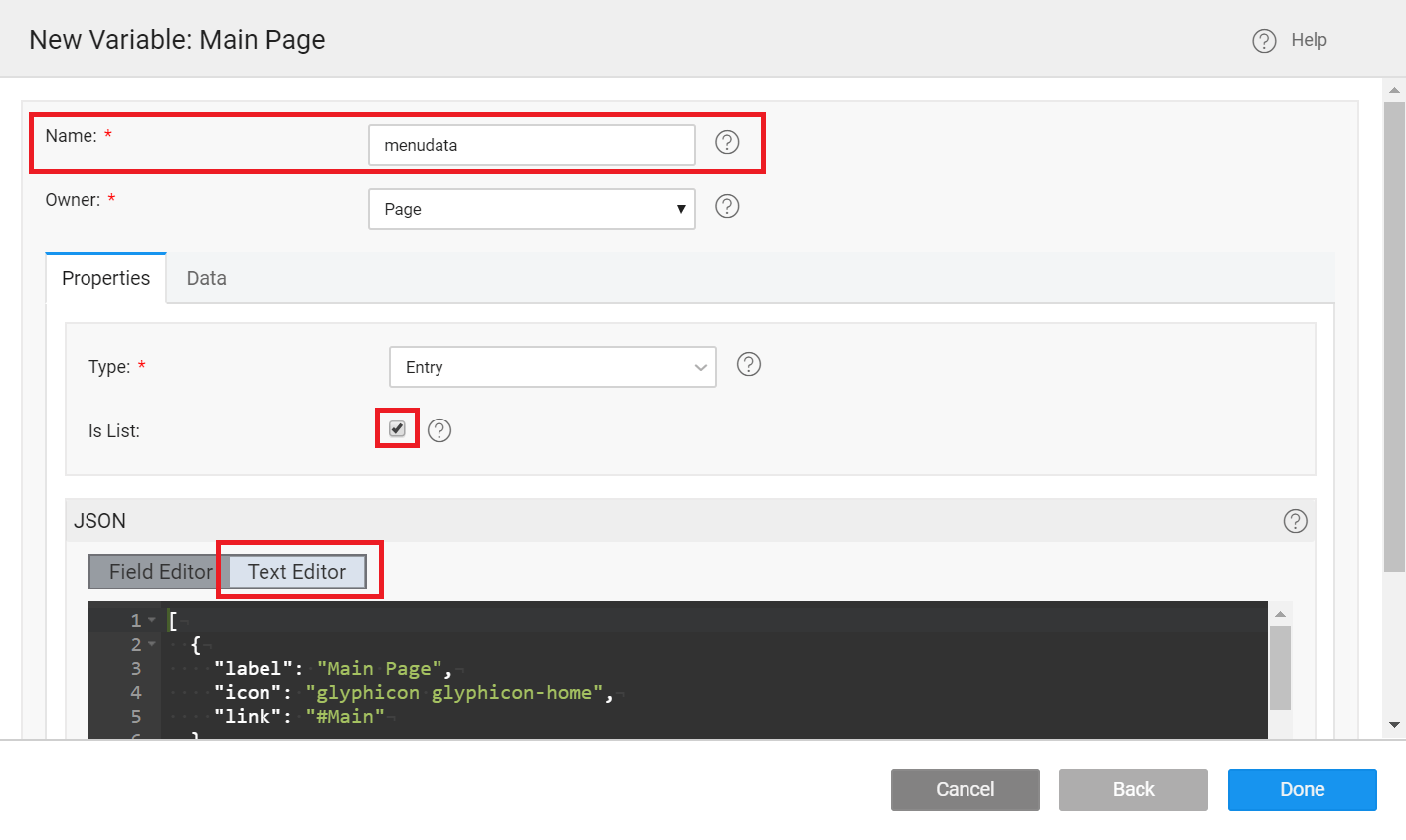 1. Add the following in the Text Editor. It defines the structure for Menu identifying Label, Icon, Link, and Children. Icons can be halflings from glyphicons or font awesome icons.
