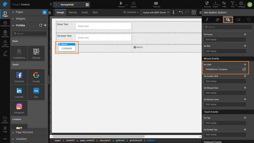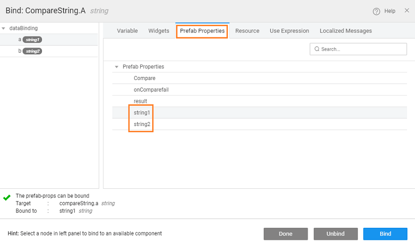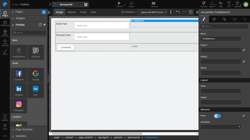 - Drop two texts strings for comparison input to Prefab, a label to hold the result from the Prefab, a button to trigger the Prefab and the Prefab on the canvas. Your canvas should look like this (we have used a Grid Layout for widget placement)