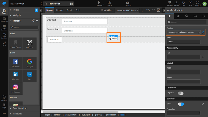 - Bind the label on the canvas to the result (outbound) from Prefab.