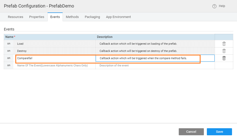 - In the Events tab, add an event (Comparefail) which will be triggered when the comparison of strings fails. The event will be defined in the JavaScript of the Prefab, the application using this Prefab will be defining the action for this event. Note, by default two events are already given - Load and Destroy