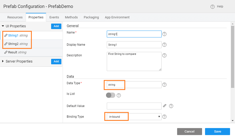 - In the Properties tab, add two inbound properties which will take in the two strings to compare
