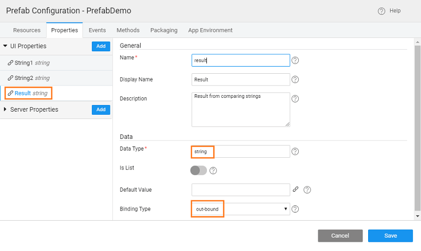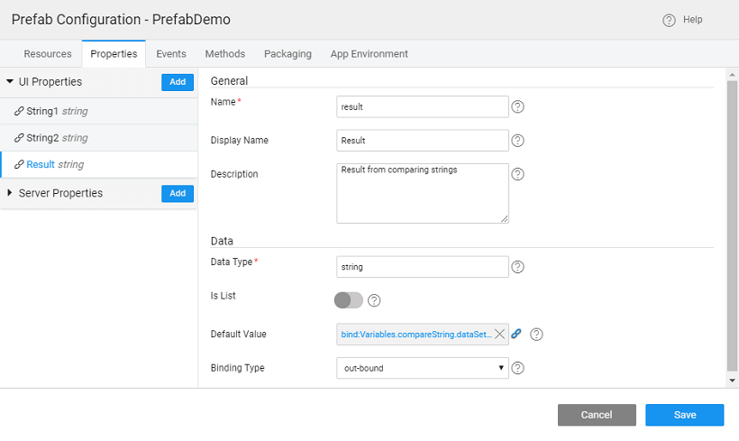 - The result from the Java method needs to be bound to the outbound property declared in the above steps. From the Prefab Settings, Properties tab bind the result of the Java Service to the outbound property of the Prefab.