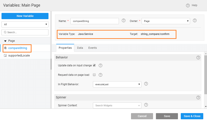 - Create a Variable to invoke the Java Service (string_compare) and method (confirm) within that service.