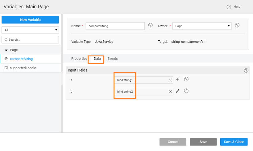 - Pass the inbound parameters of the Prefab to the Java Service, by binding them to the input fields accessible from the Data tab.