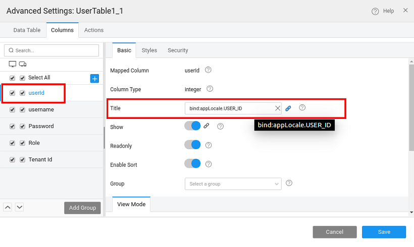 1. The column names need to be added in the localization i.e., i18n dialog as message keys