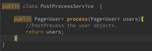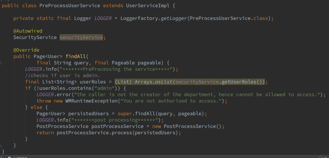In this example we have implemented the first way, i.e. delegate to superclass. A service is written to check if the login user is an admin and if the user is admin then the user details are fetched. Find below the code for both PreProcessService and PostProcessService classes Note : Please create these classes in an IDE and copy it in path specified in the following screenshot, see here to know how to work with IDE.