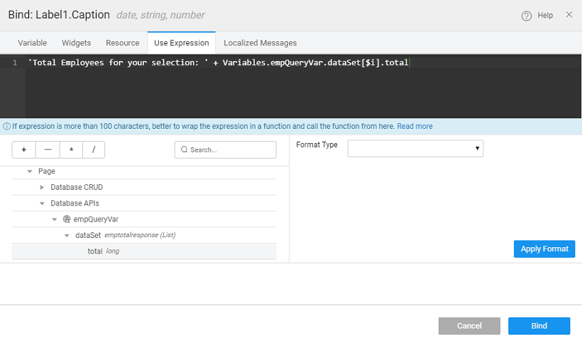 • The input parameters of the query will be bound to the selected values of the widgets and the result to the text widget for display.