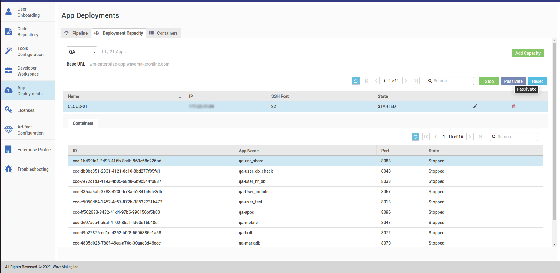 • Then you need to hit the passivate button, this will passivate all the stopped containers in the instance selected, wait till there are no stopped instances present in the instance