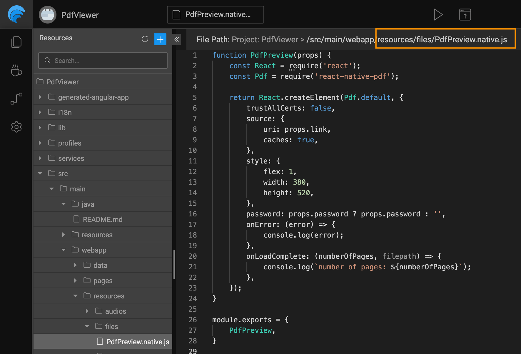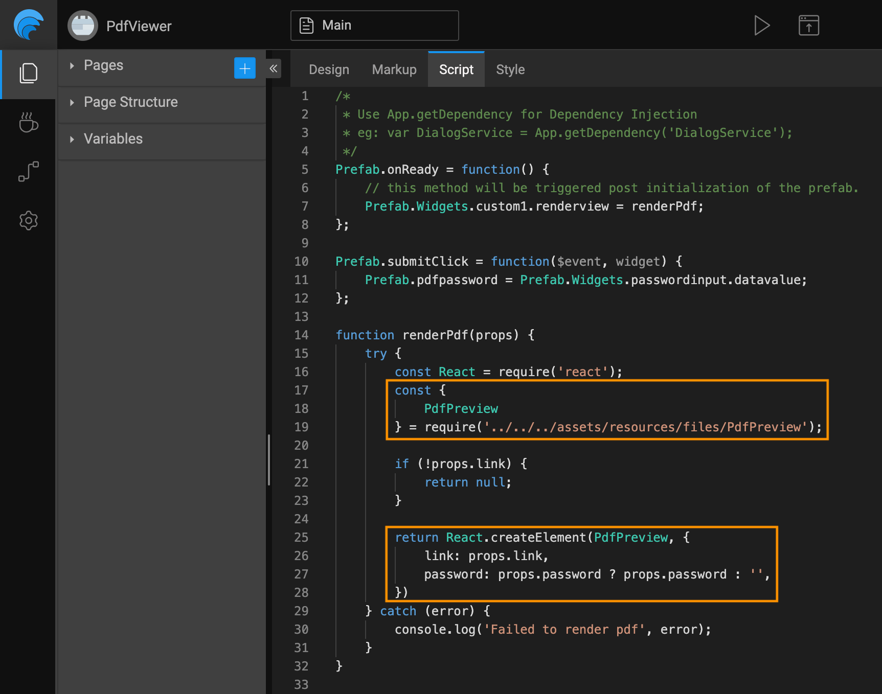 - Import the PdfPreview module in Prefab's Main Script and pass appropriate props to show pdf on the native mobile platform.