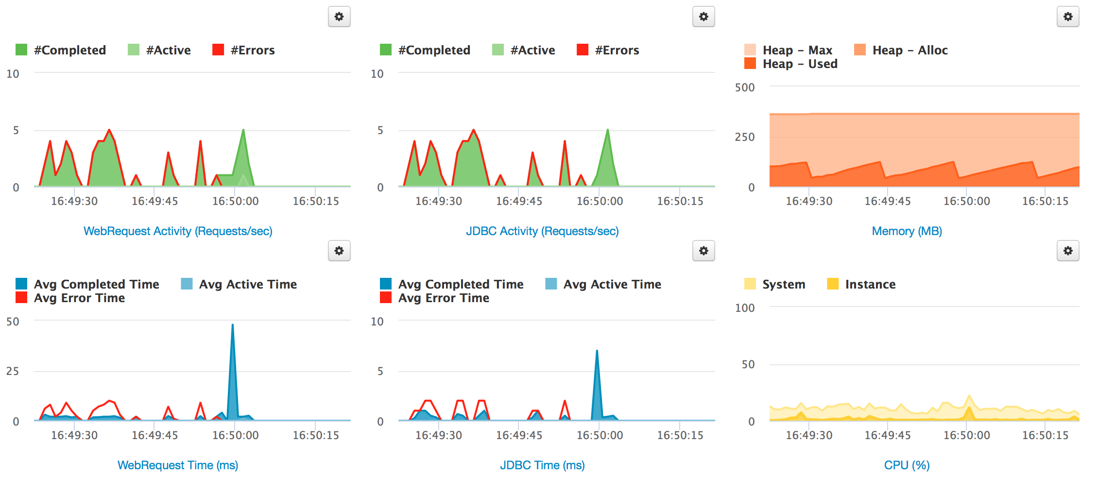 The number of JDBC requests completed and active requests at a given time. Track number of errors.